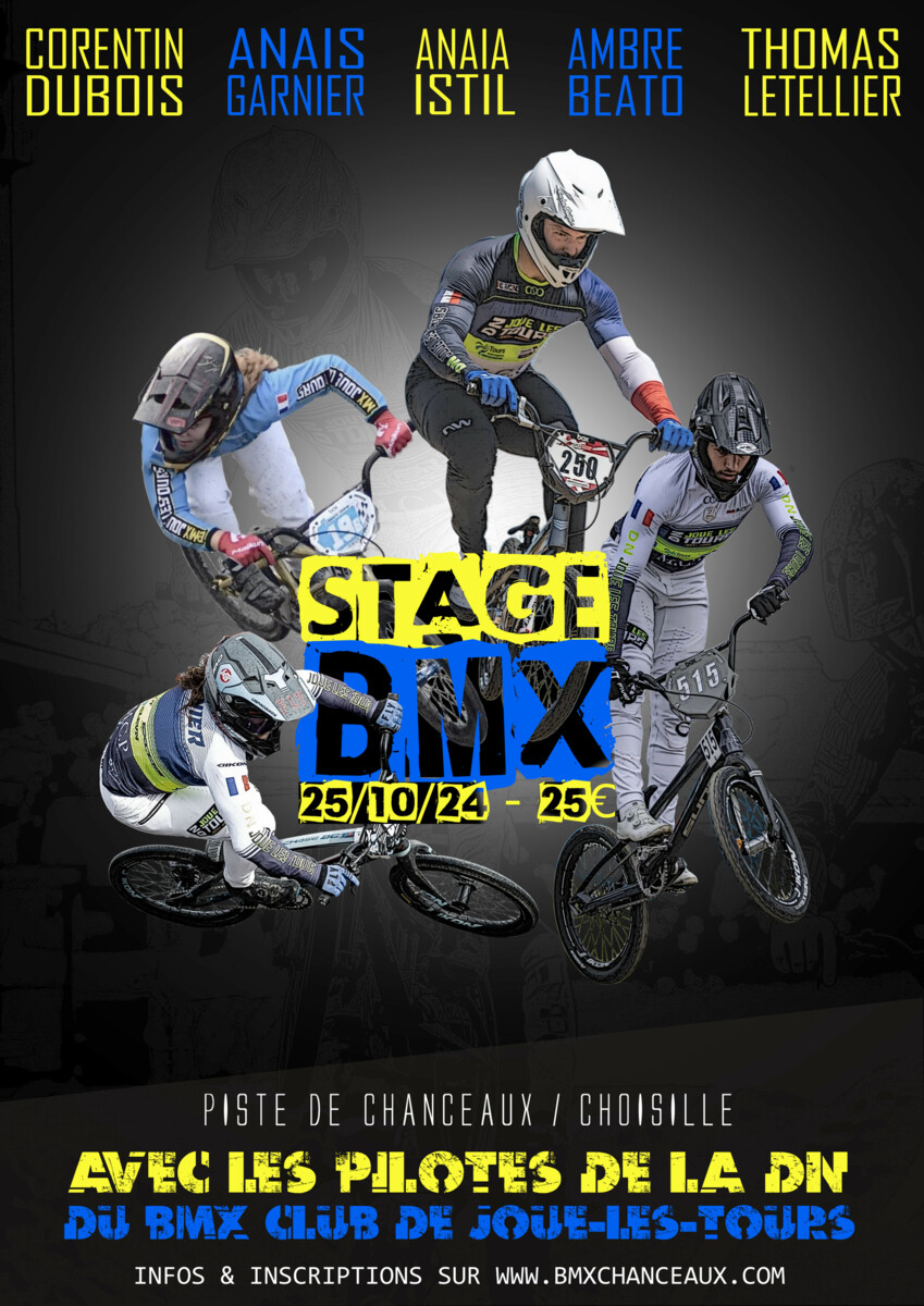Tout est dans le titre ! Stage sur la piste de l'AS CHANCEAUX BMX le vendredi 25/10 prochain encadré par certains des pilotes de la DN du club de Joué-lès-Tours ! Tarif unique 25 €, de 10H à 16H, repas tiré du sac. L'inscription se fait directement sur notre site internet via la rubrique "évènements", à droite de votre écran. Le nombre de places est limité.