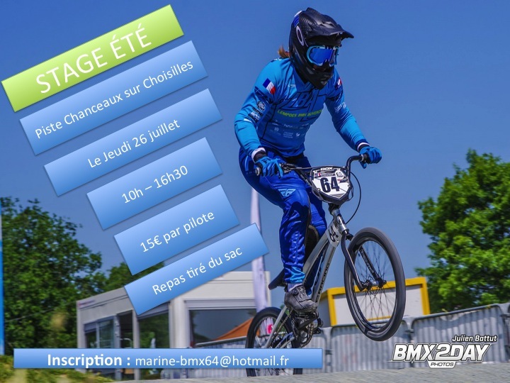 Bonjour, Marine Lacoste organise un stage BMX sur la piste de Chanceaux sur Choisille le jeudi 26 juillet de 10h à 16h30. Tous âges,tous niveaux. Tarif de 15€/pilotes. (repas tiré du sac à fournir par les parents). Inscription par mail auprès de Marine : marine-bmx64@hotmail.fr