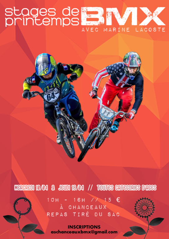 Bonjour, Les vacances approchent, et pour que nos pilotes ne s'ennuient pas, nous organisons des stages pilotes avec Marine Lacoste. Pas de distinction d'âge lors de ces 2 journées, Marine formera des sous-groupes qu'elle gérera de main de maître. Les horaires : 10h-16h avec repas tiré du sac. tarif: 15 € la journée L'inscription se fait par mail à l' adresse : aschanceauxbmx@gmail.com , en précisant bien: nom, prénom, âge du pilote, numéro de portable d'un parent, et club. Stage ouvert aux pilotes UFOLEP ET FFC. Nombre de places limité. Sportivement