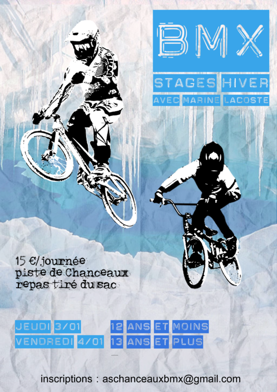 Bonjour, Les vacances approchent, et pour que nos pilotes ne s'ennuient pas, nous organisons des stages pilotes avec Marine Lacoste. Le jeudi 3 janvier 2019 pour les pilotes de 12 ans et moins. Le vendredi 4 janvier 2019 pour les pilotes de13 ans et plus. Durée : 10h-16h30 Tarif : 15 € la journée Repas tiré du sac inscription par mail : aschanceauxbmx@gmail.com Stage ouvert aux pilotes UFOLEP ET FFC. Nombre de places limité. Sportivement