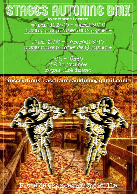 Les vacances approchent, et pour que nos pilotes ne s'ennuient pas, nous organisons des stages pilotes avec Marine Lacoste.inscription par mail : aschanceauxbmx@gmail.com