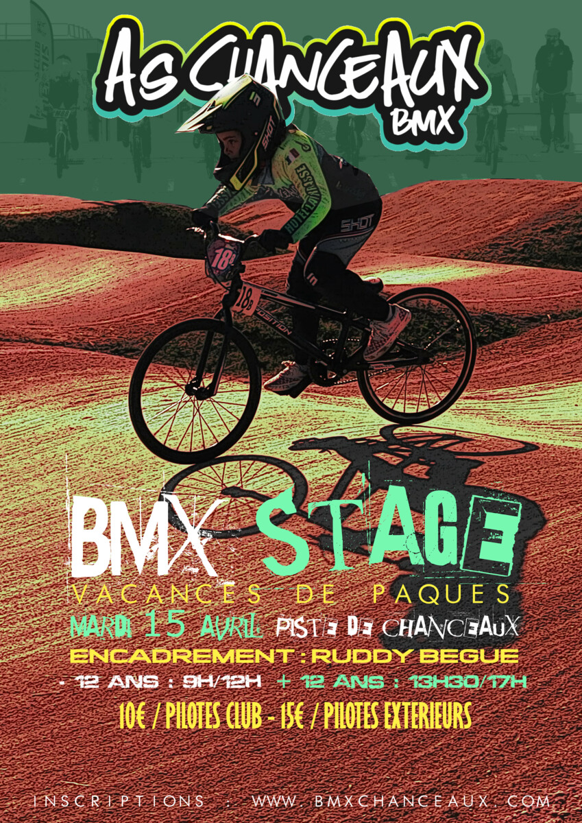 L'AS CHANCEAUX BMX organise 2 stages sur sa piste le mardi 15 avril, encadrés par Ruddy BEGUE, ancien pilote pensionnaire du pôle France jeune BMX : de 9h à 12h pour les pilotes nés en 2013 et après, de 13h30 à 17h pour les pilotes nés en 2012 et avant.
